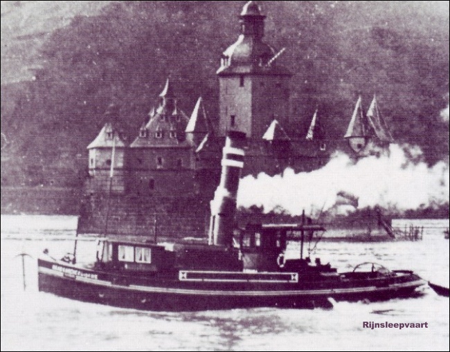 Die Reederei Aktiengesellschaft "Mainkette" ging in die Harpener Bergbau AG über. Der Dampfer hieß dann später Harpen V. Auf dem Bild hat der Schlepper neben dem Steuerhaus noch die blaue Begegnungsflagge stehen. Mit dieser Flagge hat der Schlepper vor seiner Einfahrt in das Kauber Wasser noch angezeigt, dass die entgegenkommende Talfahrt sich an seiner Steuerbordseite halten soll