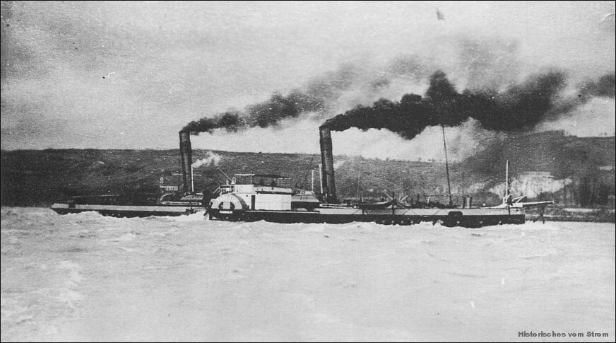 Gute Bilder von der Isteiner Schwelle sind schwer zu finden. Auch hier ist nicht viel zu erkennen. Dieses Räderboot, es ist "Baden XIV", ist speziell für die Baselfahrt gebaut worden, d.h. stark, 1300PS, und wenig Tiefgang, 1,25m. Schornstein und Brücke müssen flach umlegbar sein wegen der niedrigen Kehler Rheinbrücken. Beide Feuer sind frisch nachgelegt worden, die Rußwolken treiben ganz nach vorne. Der weisse Dampf an den Sicherheitsventilen zeigt, dass für die Passage der Isteiner Schwelle beide Kesseldrücke gut hoch stehen. Das schwerere Stück kommt aber noch, wenn nämlich das Räderboot seinen Anhang über die Schwelle ziehen muss. Es gab hier regelmässig Unterstützung von Land mit einem Draht und einer Dampfwinde. Heute sieht man davon nichts mehr.